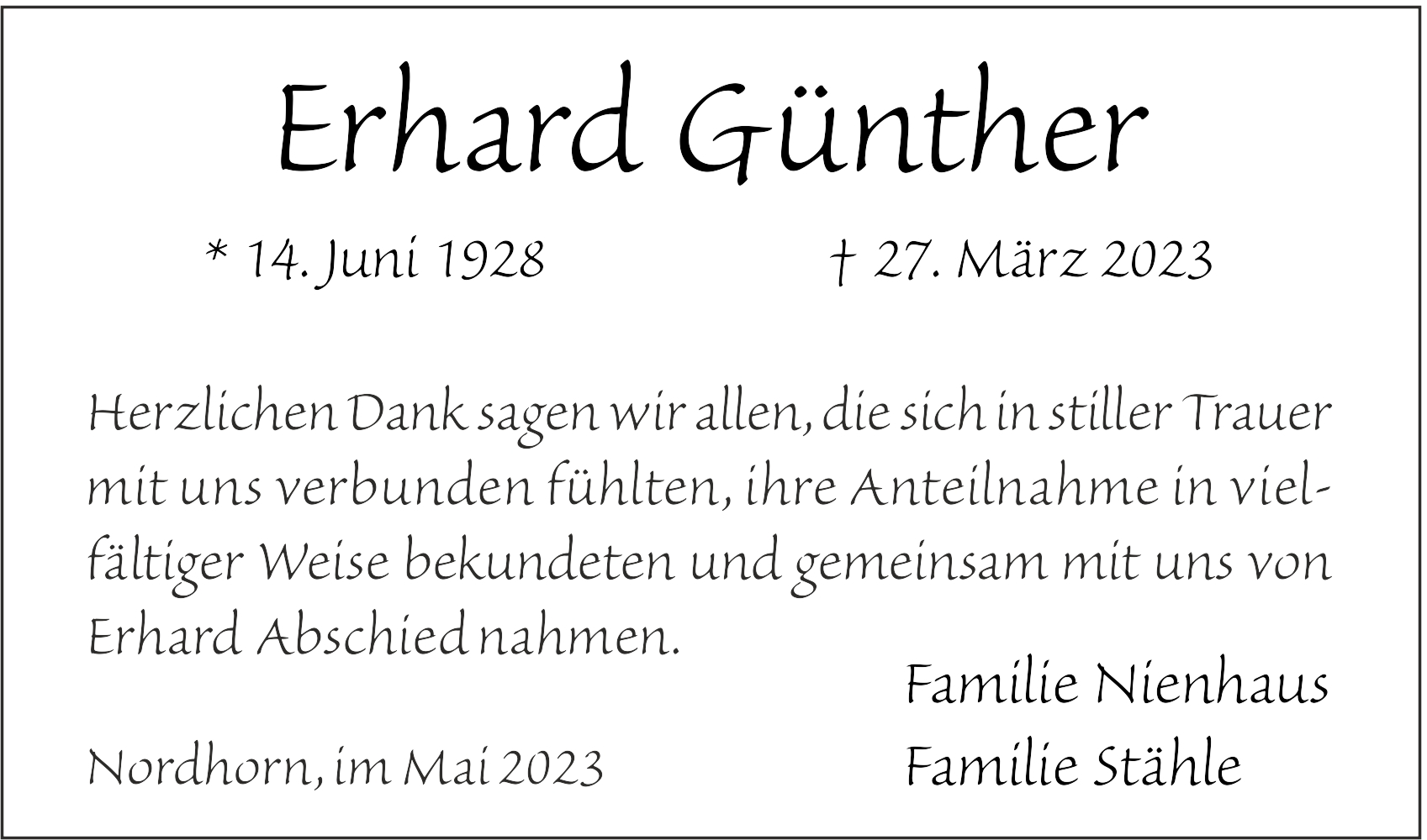 am: 03.04.2023 Kondolenz lesen von: Hans-Peter und Hanni Stähle,Kondolenz
