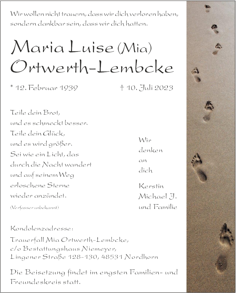 von Sarah-Christin schwarznecker, am 03.03.2024Ich hoffe es geht dir gut , da wo du jetzt bist Tante Mia!ich denke so oft an die Tage , die wir bei dir waren in ahrensbök. Und als du mit mir zum immenhof gefahren bist .wir werden uns Wiedersehen und dann drück ich dich so wie früher immer . Gib mama(Gabi) einen Kuss .tausend Küsse in den Himmel zu euch