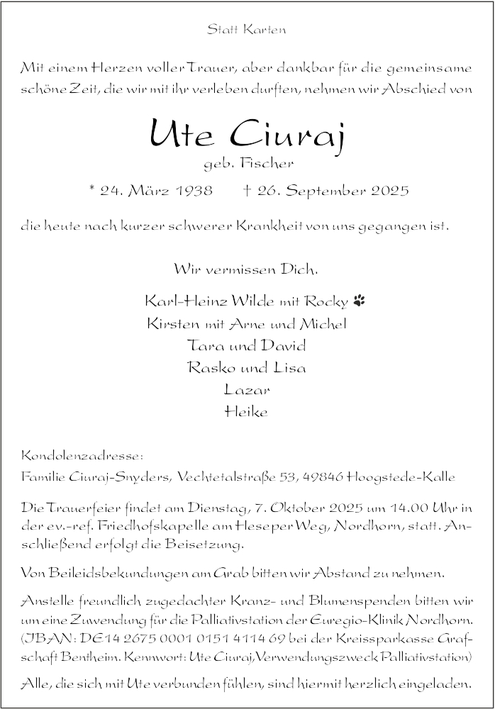 am 07.10.2025 um 14.00 Uhr ev.-ref. Friedhofskapelle am Heseper Weg, Nordhorn. Anschließend erfolgt die Beisetzung.