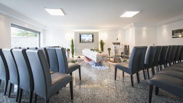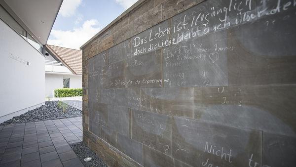 Sie stehen vor unserem Trauerforum in Nordhorn. In unserem Trauerforum können Sie sich von Ihrem Verstorbenen verabschieden. Darüber hinaus kann in unserem Trauerforum eine Trauerfeier in angenehmer Atmosphäre von bis zu 100 Personen angeboten werden. Das Trauerforum verfügt über einen eigenen Empfangsbereich und einem Trauergarten mit einer Trauerwand. Die Trauerwand kann mit Kreide beschrieben oder bemalt werden, um seiner individuellen Trauer Ausdruck zu verleihen. Das Regenwasser wird auf die Wand geleitet und lässt die Schrift mit der Zeit verblassen - analog zur psychologischen Bewältigung der Trauer. Letztendlich bieten wir im Trauerforum Veranstaltungen zu den Themen Bestattungsvorsorge, Erbrecht und Trauerbegleitung sowie Einblicke in ein Bestattungsunternehmen mit anschließender Unternehmensführung für Gruppen an.